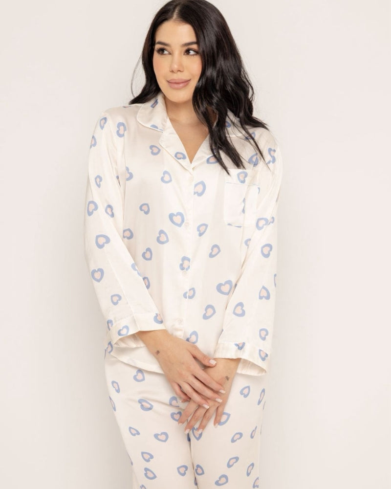 Pijama en satén con diseño de corazones Luce encantadora y cómoda con este set de pijama, ideal para las amantes del estilo y la suavidad. Su textura satinada brinda una sensación fresca y ligera sobre la piel.