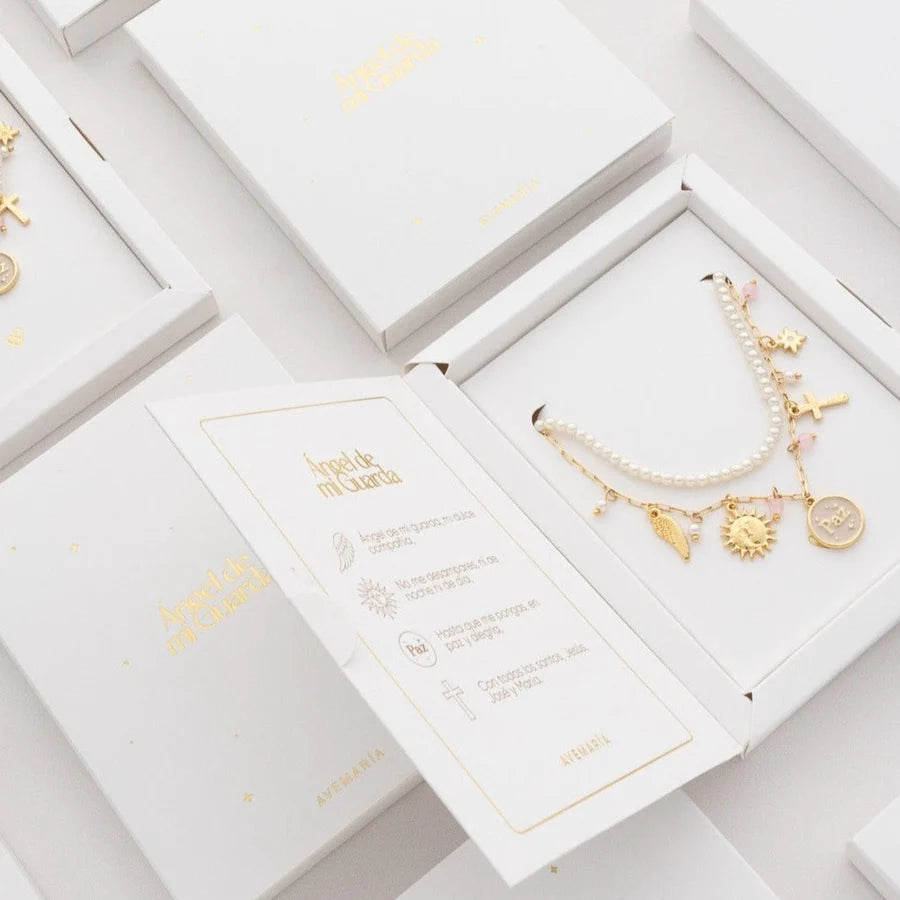 - Viene en caja divina con la oración del ángel de la guarda, cada dije representa una parte de la oración